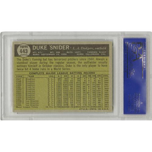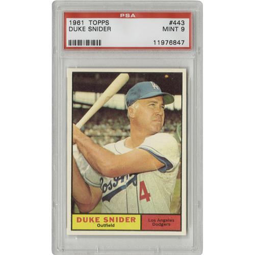 <B>1961 Topps Duke Snider #443 PSA Mint 9.</B></I> "The Silver Fox" illustrates the cause of his nickname with the white hair that sprouts from beneath his Los Angeles Dodgers cap. While the Hall of Fame center fielder shows his age, this card does not, remaining in pack-fresh condition. Only three examples have ever surpassed this tremendous representation. <BR><BR><B>Important notice:</B> Heritage usually auctions material at the rate of 200-250 lots per hour. On some occasions eBay Live bid software or the Internet may not be able to keep up with the pace of the auction. We recommend placing a realistic absentee bid now as insurance to avoid disappointment. Occasionally the auctioneer may eliminate or reject an eBay Live bid, and the auctioneer may also reopen a lot after the close of the eBay live bidding (usually because we missed an audience bid), and may reject your bid even if it shows you as the winning bidder. By bidding via eBay Live, you agree that Heritage may award the lot to another bidder at its sole discretion under the circumstances described above or any other reasonable circumstances. Since eBay bids are not shown to us until we open the lot on the floor, we treat those bids just like floor bids. In most cases the floor responds before the eBay bid is presented to us, due to Internet lag time, so for consistency we have made it a policy that floor bids are always considered first over tie eBay live bids. Also please note that all Heritage lots purchased through eBay Live carry a 22.5% Buyer's Premium. Please make sure you read the Terms and Conditions before you bid. This lot is being auctioned in conjunction with a live floor auction by Heritage Galleries & Auctioneers. All final auction and invoice information will be supplied by Heritage Galleries & Auctioneers, and all other information should be considered preliminary. Lot:19594 <BR><BR><B>Winning Notification and Billing:</B> After the FINAL session in this auction is complete, Heritage will send e-mail and snail mail invoices. This process normally takes several days. All final auction and invoice information will be supplied by Heritage Galleries & Auctioneers, and all other information should be considered preliminary. <BR><BR>This auction will be conducted on a live auction floor and over the Internet through eBay Live. If you choose to place an absentee bid, please take a moment to <font color='#0000ff'><u><a href='http://pages.ebay.com/liveauctions/help/before/laabsentee.html'>learn how eBay Live absentee bidding works</a></u></font><font color='#000000'>