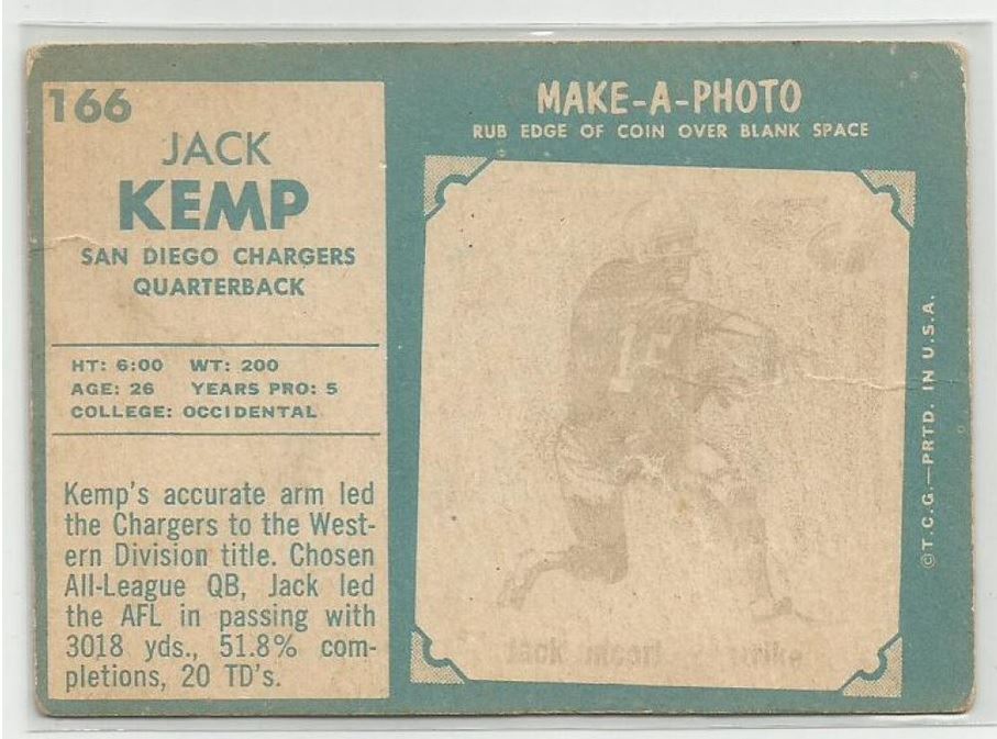 This Vintage 1961 Topps Jack Kemp Card is in Very Good Condition.