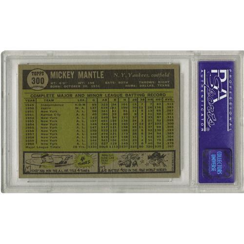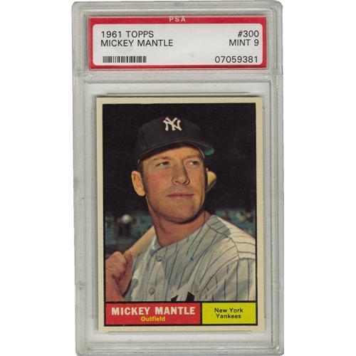 <B>1961 Topps Mickey Mantle #300 PSA Mint 9.</B></I> Only a single collector can boast of owning a superior example of this essentially flawless card, though we can't imagine what that single Gem Mint 10 specimen can offer that this one doesn't. Our examination of color, contrast, gloss, centering and corners comes up empty in any search for a flaw. The sly smile on the Mick's face says it all.<BR><BR><b>Shipping:</b> Sportscard (<a target="_blank" href="http://www.heritageauctions.com/common/shipping.php">view shipping information</a>)