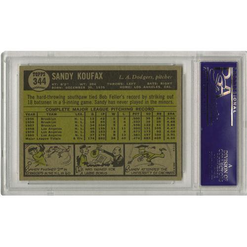 <B>1961 Topps Sandy Koufax #344 PSA Mint 9.</B></I> The Hall of Fame southpaw's first All-Star appearance came the year of this remarkable card's issue, which has survived just as brilliantly as Koufax' legacy. A clean glossy surface presents flawless centering, and not a touch of wear is to be found. If you're looking for a finer example, you'll need to track down one of only two that have ever charted higher on the PSA population report.<BR><BR><b>Shipping:</b> Sportscard (<a target="_blank" href="http://www.heritageauctions.com/common/shipping.php">view shipping information</a>)