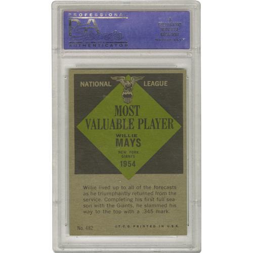 <B>1961 Topps Willie Mays MVP #482 PSA Mint 9.</B></I> Say Hey to one of the finest specimens of this popular issue ever slabbed by PSA. Offering surgically precise centering, razor corners and perfect gloss, this card leaves little doubt as to why only nineteen have ever shared its Mint 9 grade, with only a single card nabbing the impossible 10.<BR><BR><b>Shipping:</b> Sportscard (<a target="_blank" href="http://www.heritageauctions.com/common/shipping.php">view shipping information</a>)
