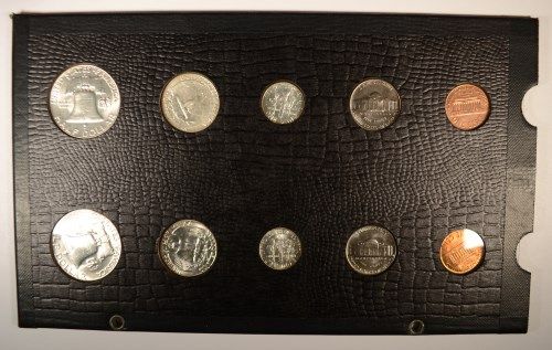 1961 U.S. MINT SET MS-65 COINS, 10 COINS IN OLD RAYMOND BOARD