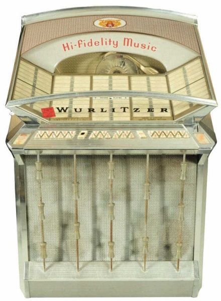 45 RPM. Working condition, comes with records. Measures 34" wide x 28" deep x 52" tall.