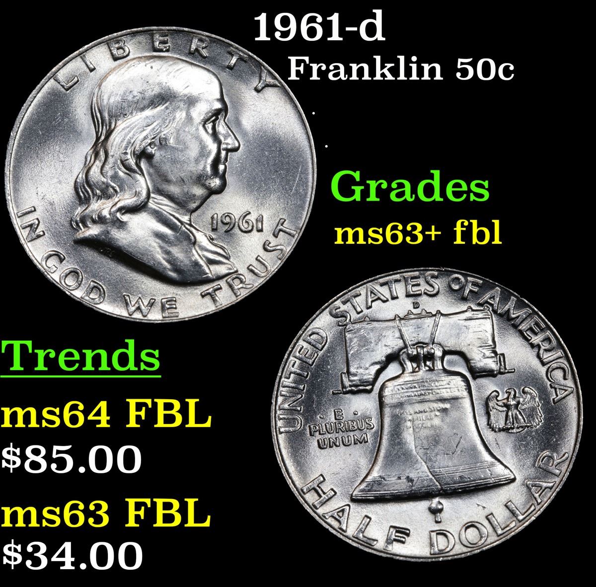 1961-d . . Franklin Half Dollar 50c Grades Select Unc+ FBL.