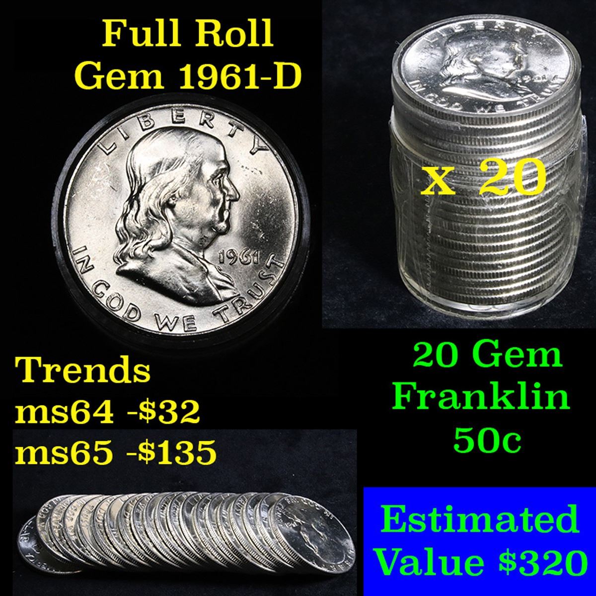 1961-d Franklin Half Dollar 50c roll, 20 pieces. A real find. A great roll of brilliant uncirculated Franklin Half Dollars. All 1961-d. Trends lists ms64 at $32/each, $320