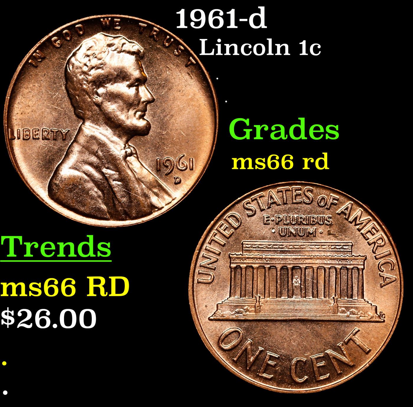 1961-d Lincoln Cent 1c Grades GEM+ Unc RD.