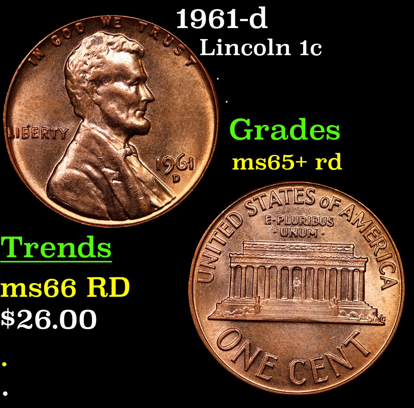 1961-d Lincoln Cent 1c Grades Gem+ Unc RD.