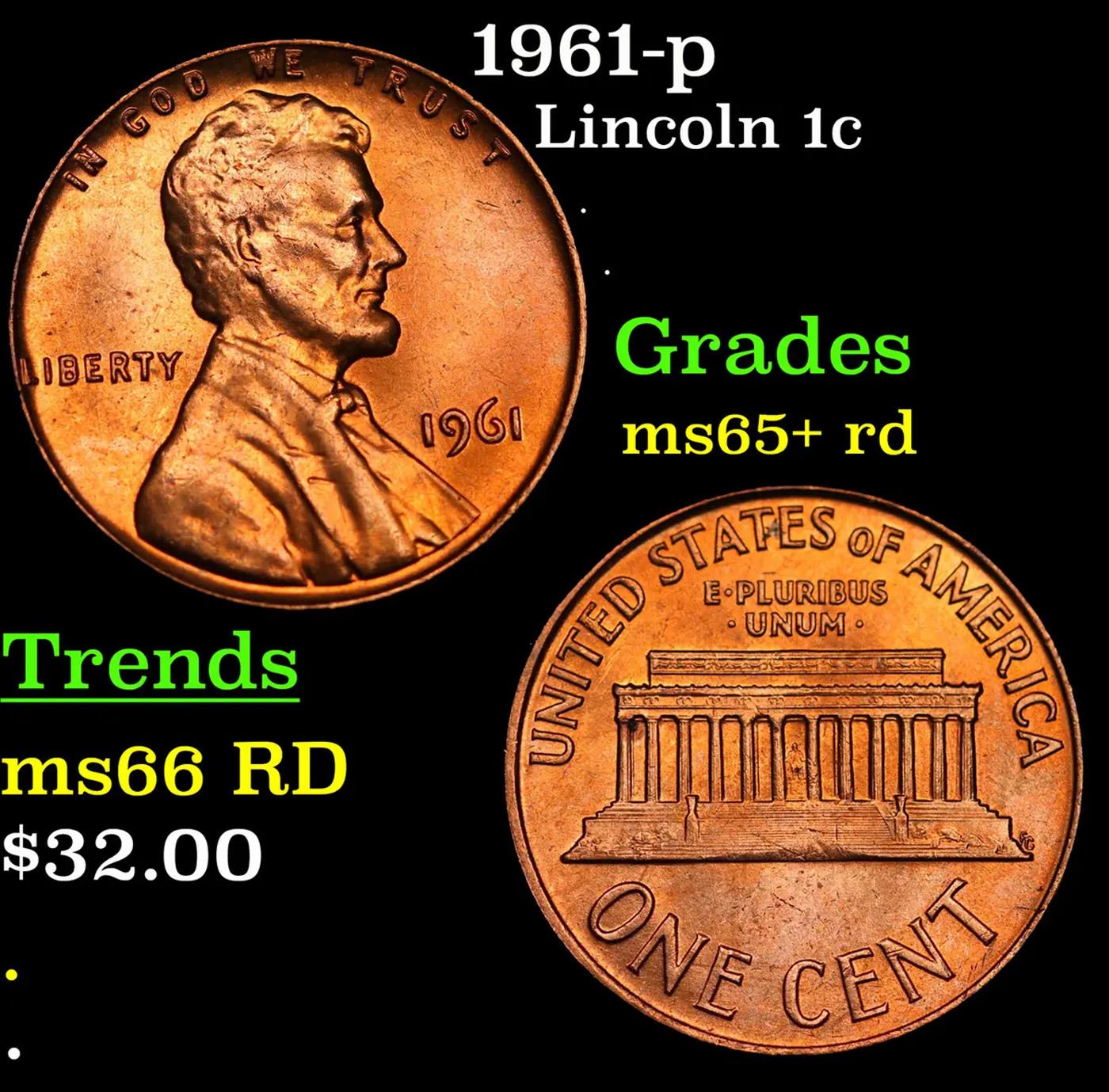 1961-p Lincoln Cent 1c Grades Gem+ Unc RD.