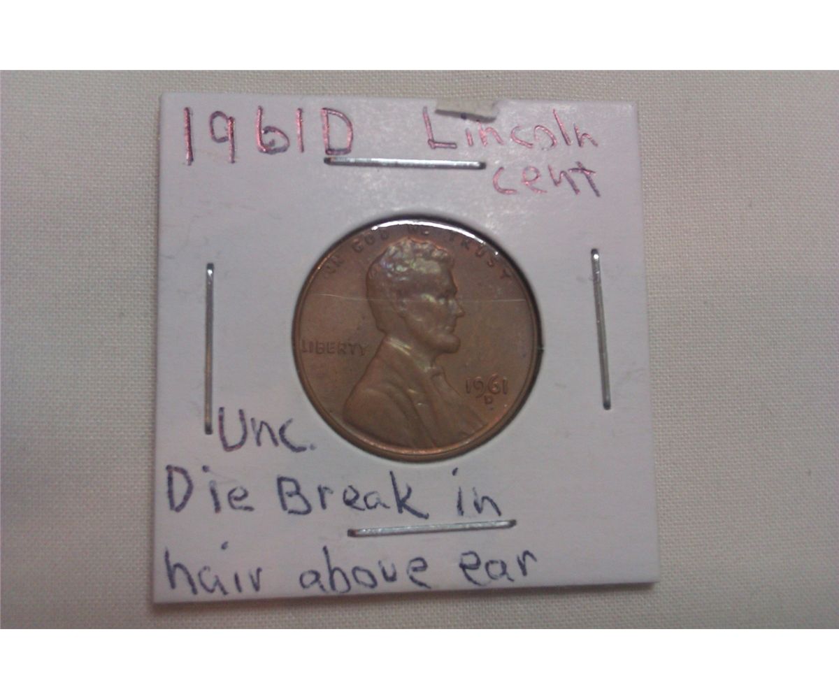 1961D Unc. **Die Break in hair above ear** Licoln Cent ***Coin, Currency & All Items Listed in this auction - Grades, Conditions and Values are not Safe Deposit Coins LLC Responsibilty. Grades, Condition and Values are determined by Consigner(s) & Buyers ONLY***