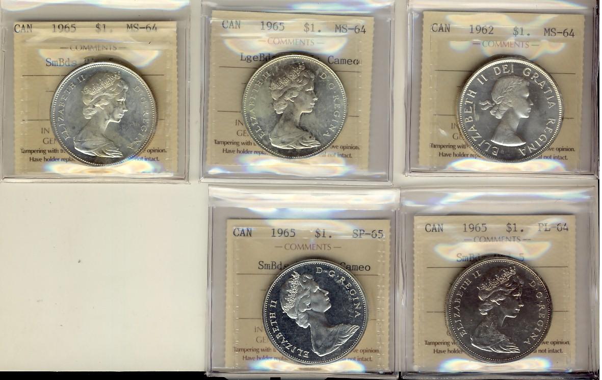 1962 $1, 1965 $1 LgBds Blt 5, SmBds Blt MS64, 1965 $1 SmBds Blt 5 Spec65 & SmBds Ptd 5 PL64. Lot of 5 coins also ICCS graded.