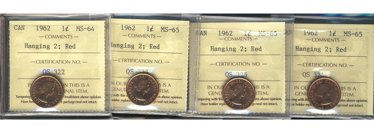 1962 1¢ Hanging 2 ICCS MS64 & MS65RD(3). Lot of 4 coins.