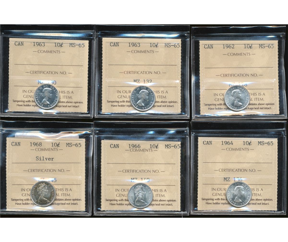 1962 10¢, 1963(2), 1964, 1966 & 1968 ICCS MS65. Lot of 6 coins.
