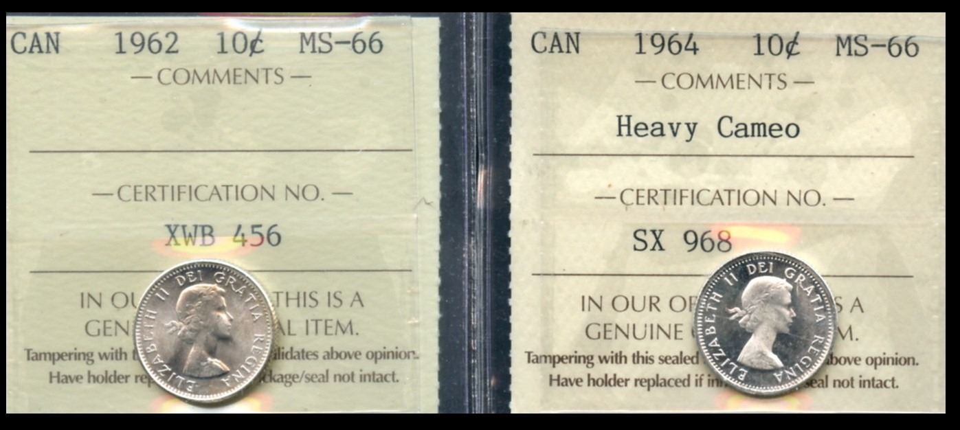 1962 10¢ & 1964 ICCS Superb Gem Mint State-66. Lot of 2 coins with 1964 designated Heavy Cameo.