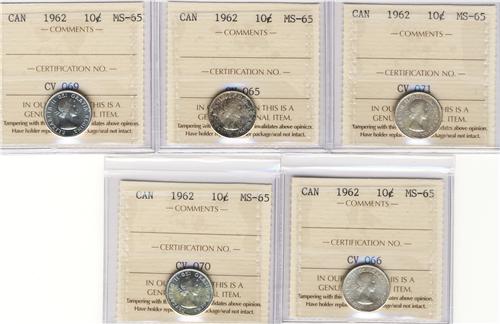 1962 10¢. Lot of 5 minstate coins all ICCS MS65 .