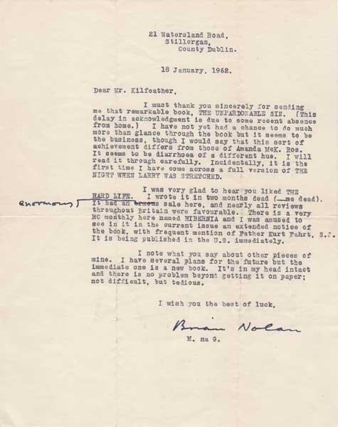From O'Nolan's home at 21 Watersland Road, Stillorgan, Co. Dublin to the writer and critic, JB Kilfeather, at "Seancoduff", 140 Stockman's Lane, Belfast. “I was very glad to hear you liked THE HARD LIFE. I wrote it in two months dead (-me dead).....an enormous sale here, and nearly all reviews throughout Britain were favourable....a very RC monthly here named HIBERNIA....was amused to see in it.........an extended notice of the book, with frequent mention of Father Kurt Fahrt, S.J. It is being published in the U.S. immediately. I note what you say about other pieces of mine. I have several plans for the future but the immediate one is a new book. It's in my head intact and there is no problem beyond getting it on paper; not difficult, but tedious. ......" Signed in ink Brian Nolan with the initials M. na G. (“Myles na gCopaleen) typed underneath. This letter shows the author in good form & his humour is to the fore as is his apparent hurry to write another book. The book he “has in my head” was to become the Dalkey Archive. However his work on this was to be delayed due to illness and work on a television series. It was eventually published in 1964. A scarce example of a letter from this comic genius, and even rarer, an example of him in good humour