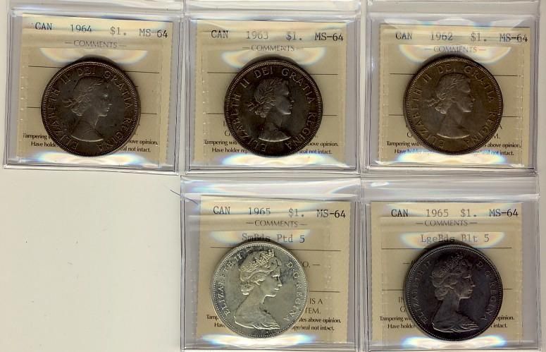 1962, 1963, 1964 & 1965 LgBd Blt 5, 1965 SmBds Ptd 5 $1 ICCS MS64. Lot of 5 coins.