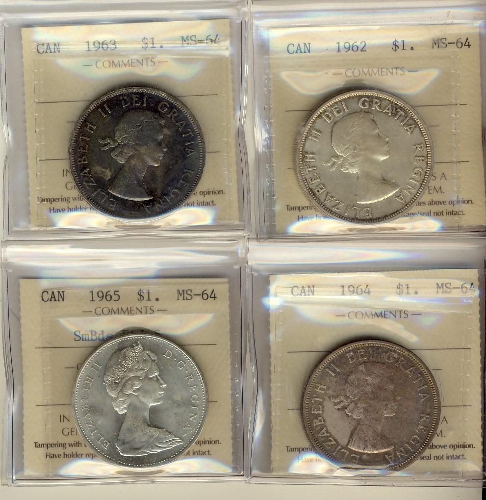 1962, 1963, 1964 & 1965 SmBds Ptd ICCS MS64. Lot of 4 coins.