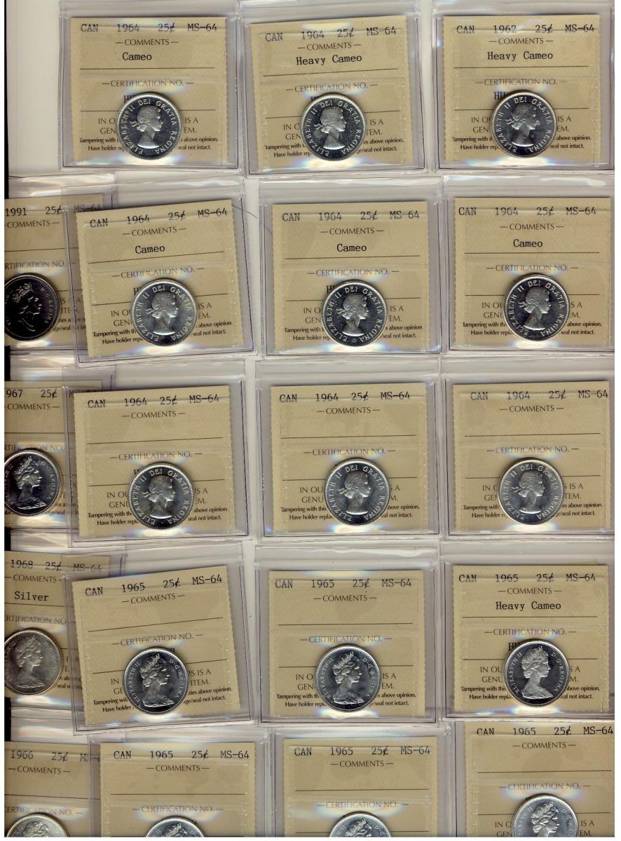 1962, 1964 (8), 1965 (6), 1966, 1967, 1968 Silv & 1991 MS64 25¢. Lot of 19 ICCS coins some with Cam