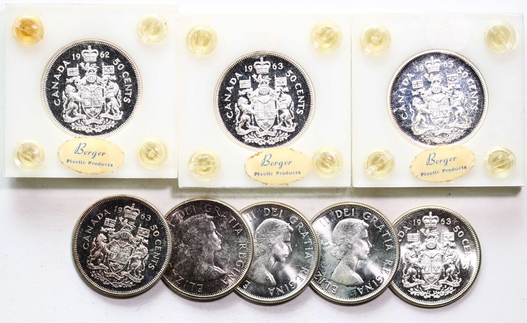 1962-1965 50¢, Most coins are Proof-Like with strong cameo contrast and a few Mint State. Lot of 8 pieces.