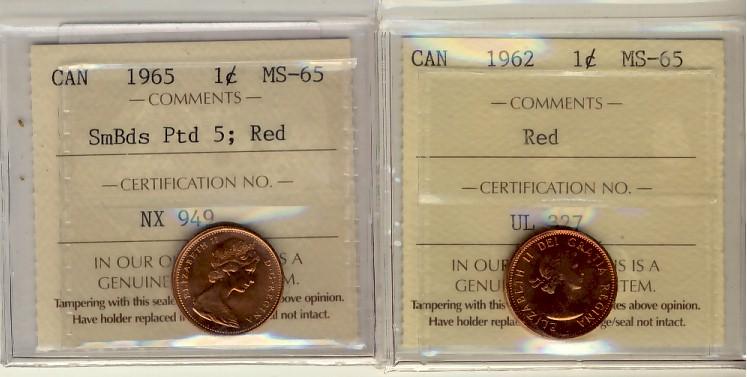 1962 & 1965 SmBds Ptd 5 1¢ ICCS MS65RD. Lot of 2 coins.