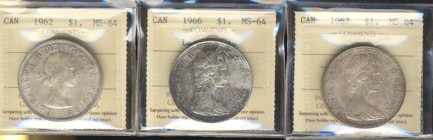 1962, 1966 Large Beads, 1967 $1 all ICCS MS64, Lot of 3 coins,