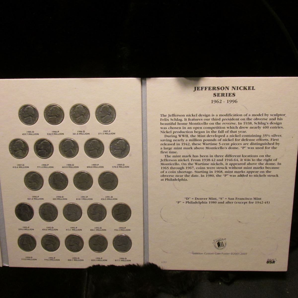 1962-1996 Jefferson Nickels Set in an Archival Quality Littleton Coin folder, Missing 1962 P & 70 D Nickels only, otherwise complete.