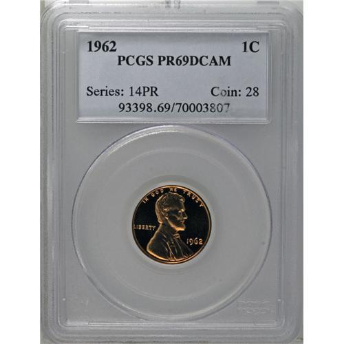 <B>1962<1C> PR69 Deep Cameo PCGS.</B></I> The carrot-copper surfaces are deeply reflective, and the devices are elegantly frosted, which creates laudable contrast. Population: 28 in 69 Deep Cameo, 0 finer (9/06).