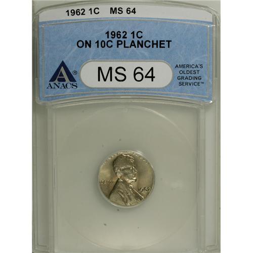 <B>1962 1C Lincoln Cent--Struck on a Dime Planchet--MS64 ANACS.</B></I> Highly lustrous with traces of rose, gold, and blue patina on each side. As a result of the smaller planchet, part of IN GOD WE TRUST is missing, and weakness is evident at the obverse devices and the opposite points on the reverse.<BR><I>From The Dale A. Konigsburg Collection, Part Two.</B></I><BR><BR><b>Shipping:</b> Coins & Currency (<a target="_blank" href="http://www.heritageauctions.com/common/shipping.php">view shipping information</a>)