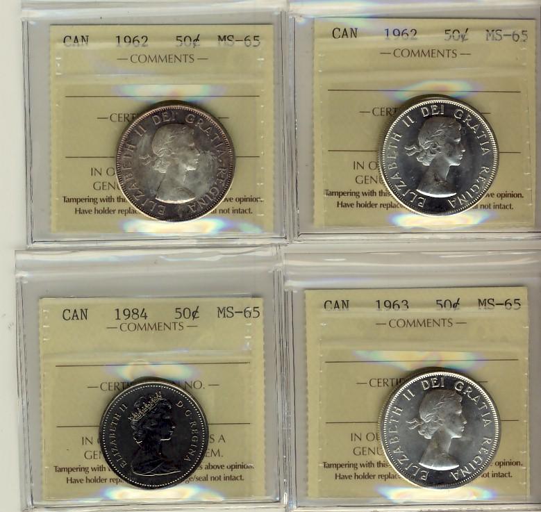 1962(2) 50¢, 1963 & 1984 ICCS MS65. Lot of 4 coins.