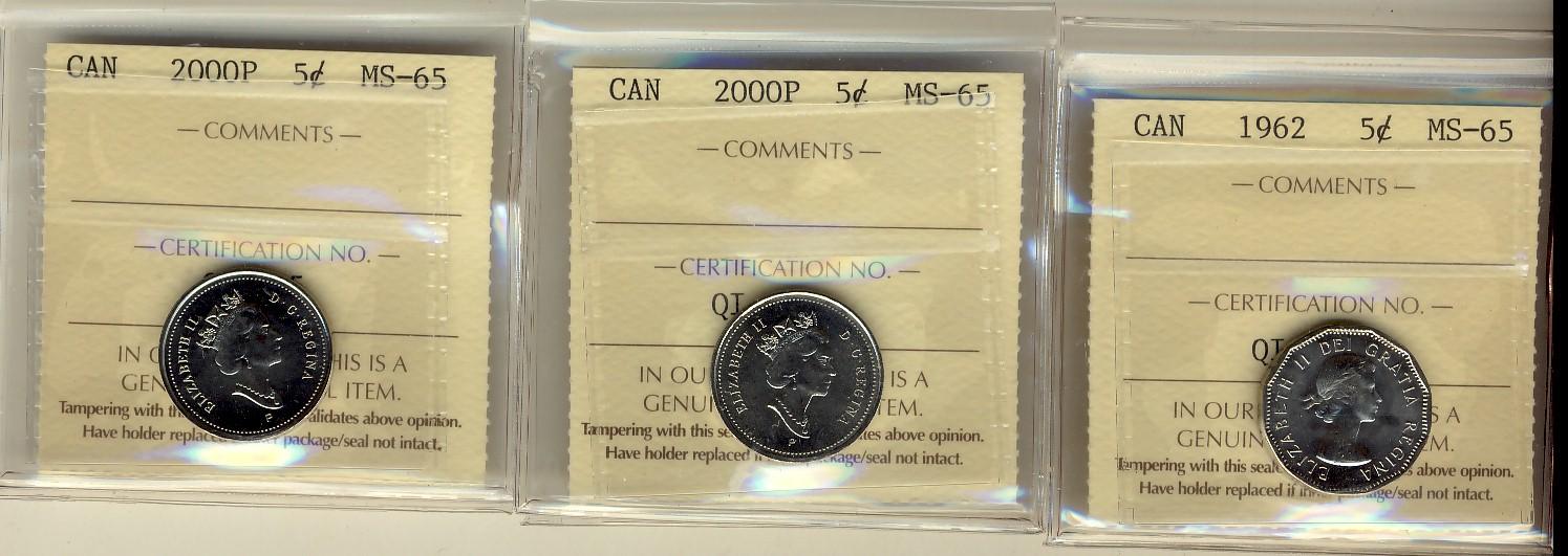 1962 & 2000P(2) 5¢ ICCS MS65. Lot of 3 coins.