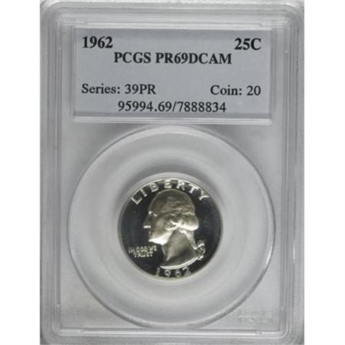 <B>1962 25C PR69 Deep Cameo PCGS.</B></I> PCGS Population (51/1). NGC Census: (37/0). Numismedia Wsl. Price for NGC/PCGS coin in PR69: $320. (#95994)<BR><BR><b>Shipping:</b> Coins & Currency (<a target="_blank" href="http://www.heritageauctions.com/common/shipping.php">view shipping information</a>)