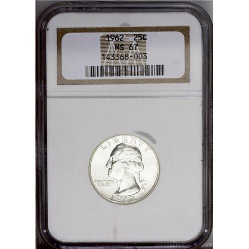 <B>1962<25C> MS67 NGC.</B></I> A wisp of gold color precludes complete brilliance, but this lustrous Superb Gem is well preserved and has a good strike.<BR><I>From The Houston Collection of Washington Quarters.</B></I>