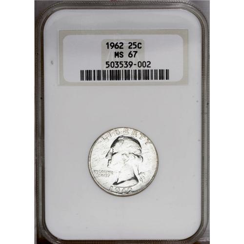 <B>1962<25C> MS67 NGC.</B></I> This highly lustrous, remarkably preserved, and boldly struck Superb Gem is mostly brilliant, but has the occasional small peach or apple-green freckle.<BR><I>From The Houston Collection of Washington Quarters.</B></I>