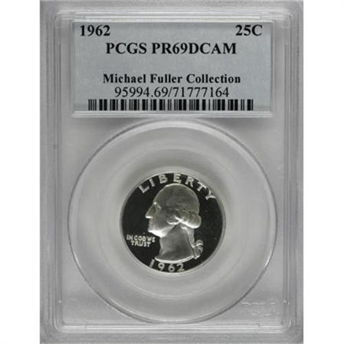 <B>1962 25C PR69 Deep Cameo PCGS.</B></I> Rich frost and fathomless fields converge on this seemingly immaculate and immensely appealing quarter. A spectacular piece from an issue that is practically impossible to acquire any finer; PCGS has graded just one such specimen (10/07).<BR><I>From The Michael Fuller Collection.</B></I><BR><BR><b>Shipping:</b> Coins & Currency (<a target="_blank" href="http://www.heritageauctions.com/common/shipping.php">view shipping information</a>)