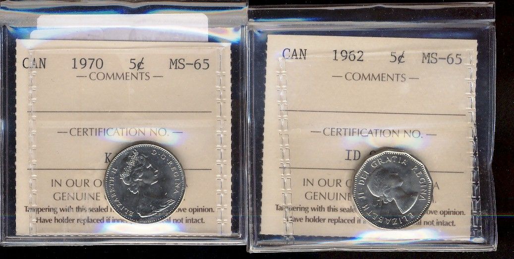 1962 5¢ & 1970 ICCS MS65. Lot of 2 coins.