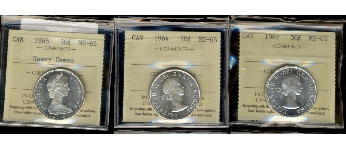 1962 50¢, 1964 & 1965 HC ICCS MS65. Lot of 3 coins.