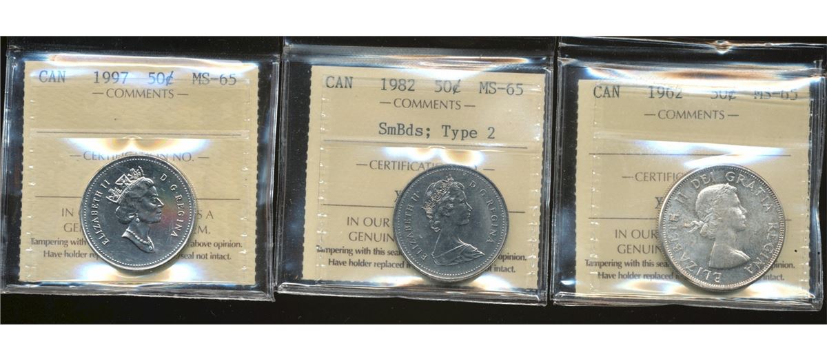 1962 50¢, 1982 SmBds T2 & 1997 ICCS MS65. Lot of 3 coins.