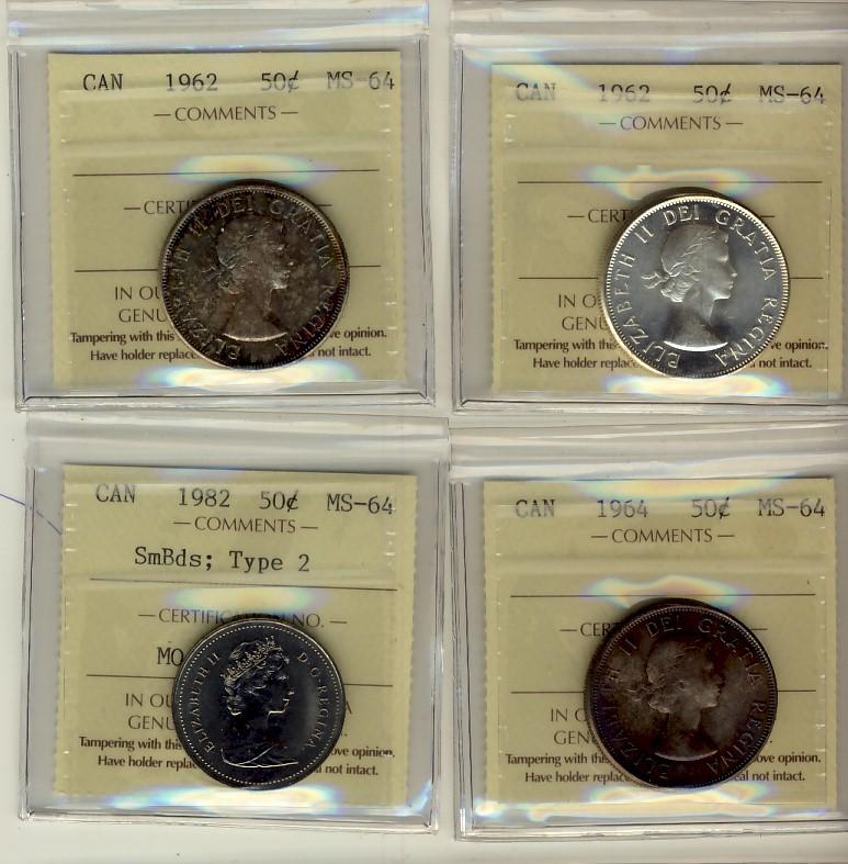 1962 50¢(2), 1964 & 1982 SmBds T.2 ICCS MS64. Lot of 4 coins.