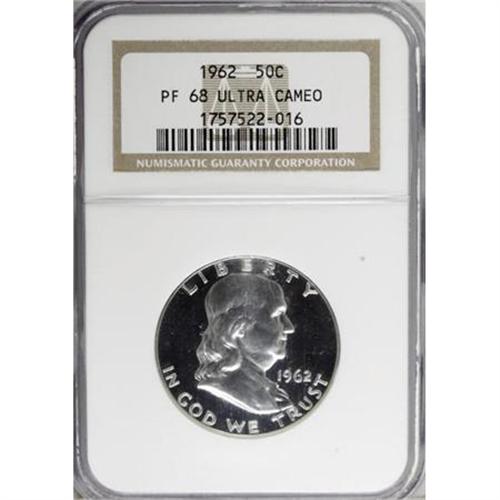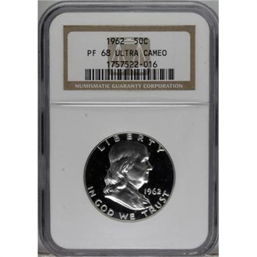 <B>1962 50C PR68 Deep Cameo NGC.</B></I> NGC Census: (212/15). PCGS Population (152/11). Numismedia Wsl. Price: $481. (#96703)<BR><BR><b>Shipping:</b> Coin/Currency (<a target="_blank" href="http://www.heritageauctions.com/common/shipping.php">view shipping information</a>\)