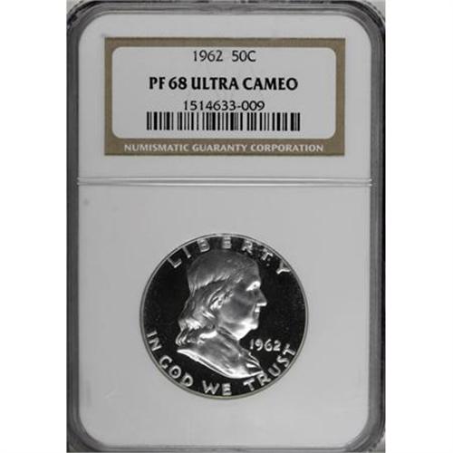<B>1962 50C PR68 Deep Cameo NGC.</B></I> NGC Census: (212/15). PCGS Population (155/11). Numismedia Wsl. Price for NGC/PCGS coin in PR68: $481. (#96703)<BR><BR><b>Shipping:</b> Coins & Currency (<a target="_blank" href="http://www.heritageauctions.com/common/shipping.php">view shipping information</a>)