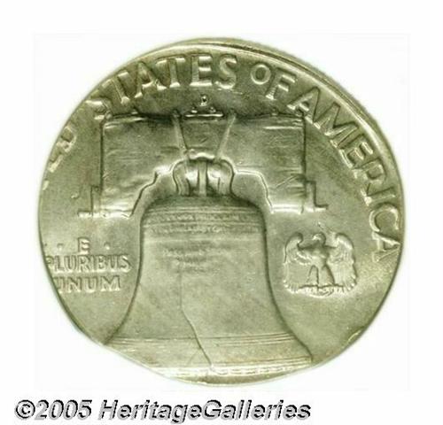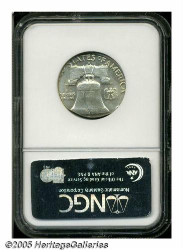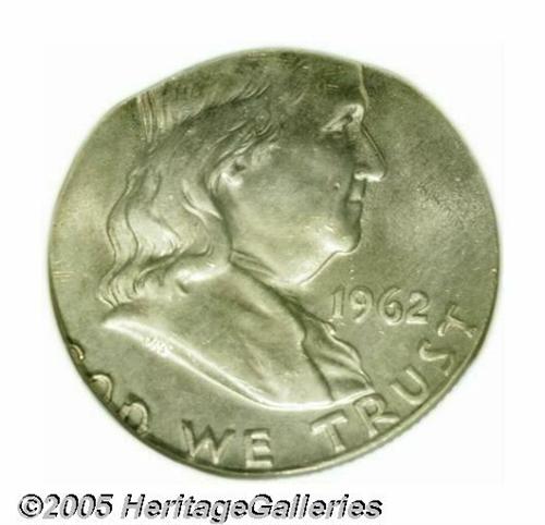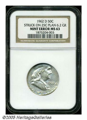 <B>1962<50C> Franklin Half Dollar--Struck on a Quarter Planchet--MS63 NGC.</B></I> 6.2 grams per the NGC label. Wrong planchet errors of any type are rare, and those on half dollars are rarities of the highest degree. Nearly all of old Ben remains visible, except for the very top of his head. The date and mintmark are both completely visible. The surfaces have frosty luster with only a trace of iridescent toning. This is a wonderful example with excellent eye appeal and a high degree of desirability.