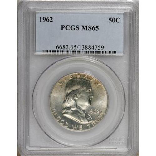 <B>1962 50C MS65 PCGS.</B></I> PCGS Population (450/14). NGC Census: (780/18). Mintage: 9,700,000. Numismedia Wsl. Price for NGC/PCGS coin in MS65: $110. (#6682)<BR><BR><B>Coin Engraver:</B> John R. Sinnock<BR><BR><b>Shipping:</b> Coins & Currency (<a target="_blank" href="http://www.heritageauctions.com/common/shipping.php">view shipping information</a>\)