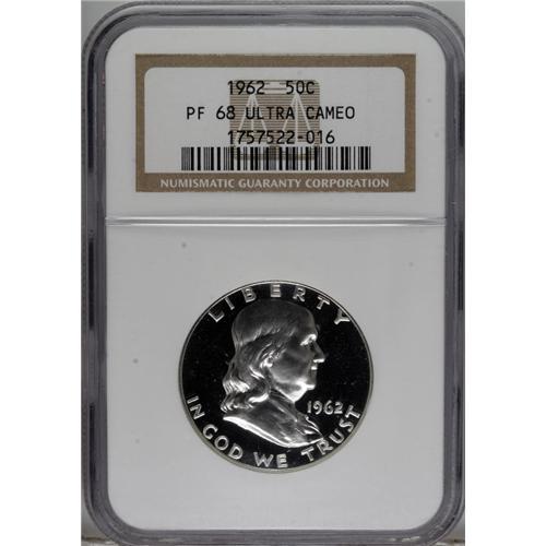 <B>1962 50C PR68 Deep Cameo NGC.</B></I> NGC Census: (212/15). PCGS Population (152/11). Numismedia Wsl. Price: $481. (#96703)<BR><BR><b>Shipping:</b> Coin/Currency (<a target="_blank" href="http://www.heritageauctions.com/common/shipping.php">view shipping information</a>)