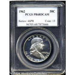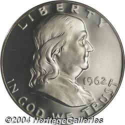 <B>1962<50C> PR68 Deep Cameo PCGS.</B></I> Fully struck with pristine surfaces and beautiful cobalt-blue color in the deeply reflective fields. The frosted silver-gray devices seem to float above the dark, watery fields.<BR><I>From the JFS Collection.</B></I> <BR><BR><B>Important notice:</B> Heritage usually auctions material at the rate of 200-250 lots per hour. On some occasions eBay Live bid software or the Internet may not be able to keep up with the pace of the auction. We recommend placing a realistic absentee bid now as insurance to avoid disappointment. Occasionally the auctioneer may eliminate or reject an eBay Live bid, and the auctioneer may also reopen a lot after the close of the eBay live bidding (usually because we missed an audience bid), and may reject your bid even if it shows you as the winning bidder. By bidding via eBay Live, you agree that Heritage may award the lot to another bidder at its sole discretion under the circumstances described above or any other reasonable circumstances. Since eBay bids are not shown to us until we open the lot on the floor, we treat those bids just like floor bids. In most cases the floor responds before the eBay bid is presented to us, due to Internet lag time, so for consistency we have made it a policy that floor bids are always considered first over tie eBay live bids. Also please note that all Heritage lots purchased through eBay Live carry a 20% Buyer's Premium. Please make sure you read the Terms and Conditions before you bid. </span></font></tr></table></td></tr></table>