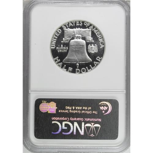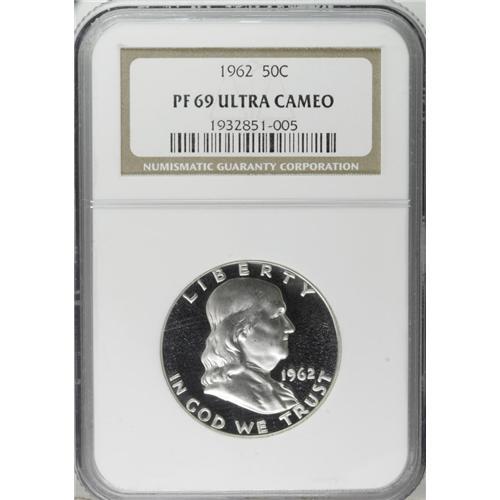 <B>1962 50C PR69 Ultra Cameo NGC.</B></I> Outstanding white-on-black contrast confirms the immense quality of this immaculate Franklin half. Brilliant aside from a pinpoint copper-red fleck northwest of the chin. More than three million proof Franklin halves were struck, but perhaps only a few thousand pieces among these possess deeply frosted motifs and legends. Census: 15 in 69, 0 finer (11/06).<BR><BR><b>Shipping:</b> Coin/Currency (<a target="_blank" href="http://www.heritageauctions.com/common/shipping.php">view shipping information</a>)