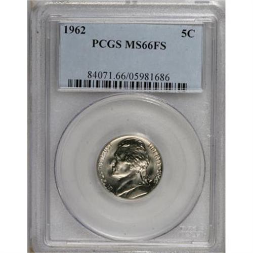 <B>1962 5C MS66 Full Steps PCGS.</B></I> This flashy Premium Gem offers bold detail, vibrant luster, and minimal patina. Carefully preserved and desirable. This piece is tied for the finest Full Steps example graded by PCGS (10/07).<BR><BR><b>Shipping:</b> Coins & Currency (<a target="_blank" href="http://www.heritageauctions.com/common/shipping.php">view shipping information</a>)