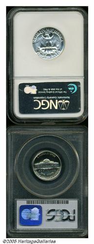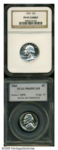 <B>1962<5C> Nickel PR69 Deep Cameo PCGS,</B></I> no mentionable spots or flaws, untoned, good contrast; and a <B>1953 Quarter PR67 Cameo NGC,</B></I> brilliant, pleasing white on black contrast, a trace of carbon denies perfection.