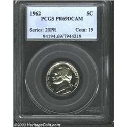 <TR><TD width="100%"><TABLE cellSpacing=1 cellPadding=3 width="100%" border=0><TBODY><TR><TD width="100%" bgColor=#79735c><FONT face=arial color=#ffffff size=3><B>Description</B> </FONT></TD></TR><TR><TD width="100%" bgColor=#ffffff><FONT face=arial size=2><B>1962 5C PR69 Deep Cameo PCGS.</B></I> Awesomely mirrored fields and gently frosted devices bring depth to this piece. A very small lintmark below Jefferson's chin is the only distraction, and a barely perceptible one at that.<BR><I>From the V. A. Everest Collection.</B></I> </FONT></TD></TR></TBODY></TABLE></TD></TR></TBODY></TABLE><BR><A name=PricesRealized></A><TABLE cellSpacing=0 cellPadding=0 width="100%" bgColor=#000000 border=0><TBODY><TR><TD width="100%"><TABLE cellSpacing=1 cellPadding=3 width="100%" border=0><TBODY><TR><TD width="100%" bgColor=#79735c><A name=PR><FONT face=arial color=#ffffff size=3><B>Previous Prices from Heritage Auctions</B> </FONT></A></TD></TR><TR><TD bgColor=#f6f6ed><TABLE cellSpacing=0 cellPadding=0 width="100%" border=1><TBODY><TR><TD align=middle width="33%"><B>Date</B></TD><TD align=middle width="33%"><B>Service</B></TD><TD align=middle width="33%"><B>Price</B></TD></TR><TR bgColor=whitesmoke><TD width="33%"><B>11/25/2002</B></TD><TD width="33%">NGC</TD><TD width="33%">$218.50</TD></TR></TBODY></TABLE></TD></TR><TR><TD bgColor=#ffffff><FONT face=arial size=1 ?>PLEASE NOTE: All prices realized reflect the final hammer price PLUS the buyer's premium in auctions that charge a buyer's premium. Each item has a notation at the top of the listing indicating whether that lot included a buyer's premium. Example: A item that sells with a final hammer price of $100 and a 20% buyer's premium will display with a price realized of $120. All information listed is intended to be as accurate as possible, but errors are possible. Please use this guide carefully and inform us of any inaccuracies. </FONT></TD></TR></TBODY></TABLE></TD></TR></TBODY></TABLE><BR><TABLE cellSpacing=0 cellPadding=0 width="100%" bgColor=#000000 border=0><TBODY><TR><TD width="100%"><TABLE cellSpacing=1 cellPadding=3 width="100%" border=0><TBODY><TR><TD width="100%" bgColor=#79735c colSpan=6><FONT face=arial color=#ffffff size=3><B>Price Guide*</B> </FONT></TD></TR><TR bgColor=#f6f6ed><TD align=middle><B>Grade</B> </TD><TD align=middle><B>Coin World<BR>(Trends)</B> </TD><TD align=middle><B>Numismedia<BR>Retail</B> </TD><TD align=middle><B>Numismedia<BR>Wholesale</B> </TD><TD align=middle><B>Coin<BR>Universe</B> </TD><TD align=middle><B>Heritage<BR>Value Index</B> </TD></TR><TR bgColor=#ffffff><TD align=middle>68</TD><TD align=right>---</TD><TD align=right>---</TD><TD align=right>---</TD><TD align=right>$240.00</TD><TD align=right>$168.00</TD></TR><TR style="FONT-WEIGHT: bold" bgColor=#cccfdd><TD align=middle>69</TD><TD align=right>---</TD><TD align=right>---</TD><TD align=right>---</TD><TD align=right>$1,175.00</TD><TD align=right>$822.50</TD></TR><TR bgColor=#ffffff><TD align=middle>70</TD><TD align=right>---</TD><TD align=right>---</TD><TD align=right>---</TD><TD align=right>---</TD><TD align=right>---</TD></TR><TR bgColor=#ffffff><TD colSpan=6><FONT size=1>*All information listed is intended to be as accurate as possible, but errors are possible. No item may be returned or refused based on this information which is provided as a service to our customers. You should contact each pricing source directly to determine the accuracy of this information. </FONT></TD></TR></TBODY></TABLE></TD></TR></TBODY></TABLE><BR><TABLE cellSpacing=0 cellPadding=0 width="100%" bgColor=#000000 border=0><TBODY><TR><TD width="100%"><TABLE cellSpacing=1 cellPadding=3 width="100%" border=0><TBODY><TR><TD width="100%" bgColor=#79735c><FONT face=arial color=#ffffff size=3><B>Population Guide</B> </FONT></TD></TR><TR bgColor=#ffffff><TD align=middle><!-- Begin Output of Population Grid--><TABLE cellSpacing=0 cellPadding=0 width="100%" border=0><TBODY><TR><TD vAlign=center><TABLE cellSpacing=0 width="100%" border=1 cellsadding="3"><TBODY><TR><TD vAlign=center><TABLE cellSpacing=0 cellPadding=3 width="100%" border=1><TBODY><TR><TD vAlign=center align=middle bgColor=#f0f1e8 colSpan=2 <CENTER><FONT face=Arial size=2><B>PCGS Pop </B></FONT><CENTER></CENTER></TD><TD vAlign=center align=middle bgColor=#f0f1e8 colSpan=2><CENTER><FONT face=Arial size=2><B>NGC Pop</B></CENTER></FONT></TD></TR><TR><TD vAlign=center><FONT face=Arial size=2>(69)</FONT> </TD><TD vAlign=center align=right><FONT face=Arial size=2>37</FONT> </TD><TD vAlign=center><FONT face=Arial size=2>(69)</FONT> </TD><TD vAlign=center align=right><FONT face=Arial size=2>10</FONT> </TD></TR><TR><TD vAlign=center><FONT face=Arial size=2>(>69)</FONT> </TD><TD vAlign=center align=right><FONT face=Arial size=2>0</FONT> </TD><TD vAlign=center><FONT face=Arial size=2>(>69)</FONT> </TD><TD vAlign=center align=right><FONT face=Arial size=2>0</FONT> </TD></TR></TBODY></TABLE></TD></TR></TBODY></TABLE></TD></TR></TBODY></TABLE><!-- End Output of Population Grid--></TD></TR></TBODY></TABLE></TD></TR></TBODY></TABLE><BR><TABLE cellSpacing=0 cellPadding=0 width="100%" bgColor=#000000 border=0><TBODY><TR> Important notice: We expect to be auctioning lots at the rate of 200-250 per hour. On occasion eBay live bid software cannot keep up with the pace of the auctions where 4-5 lots per minute can hammer down, so we recommend that you place a realistic absentee bid now as insurance to avoid disappointment. Also please note that all Heritage/CAA lots purchased through eBay Live carry a 20% Buyer's Premium. Please make sure you read the Terms and Conditions.