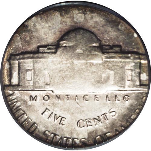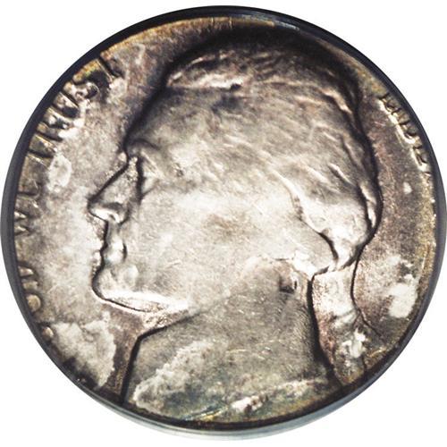 <B>1962<5C> Jefferson Nickel--Struck on a Silver Dime Planchet--AU58 PCGS.</B></I> Violet and pale gold patina appears on this mint error. The tiny fragments of the date are enough to identify, though the space where the mintmark would be is off the planchet. Lustrous with light friction that blends with the requisite soft strike.
