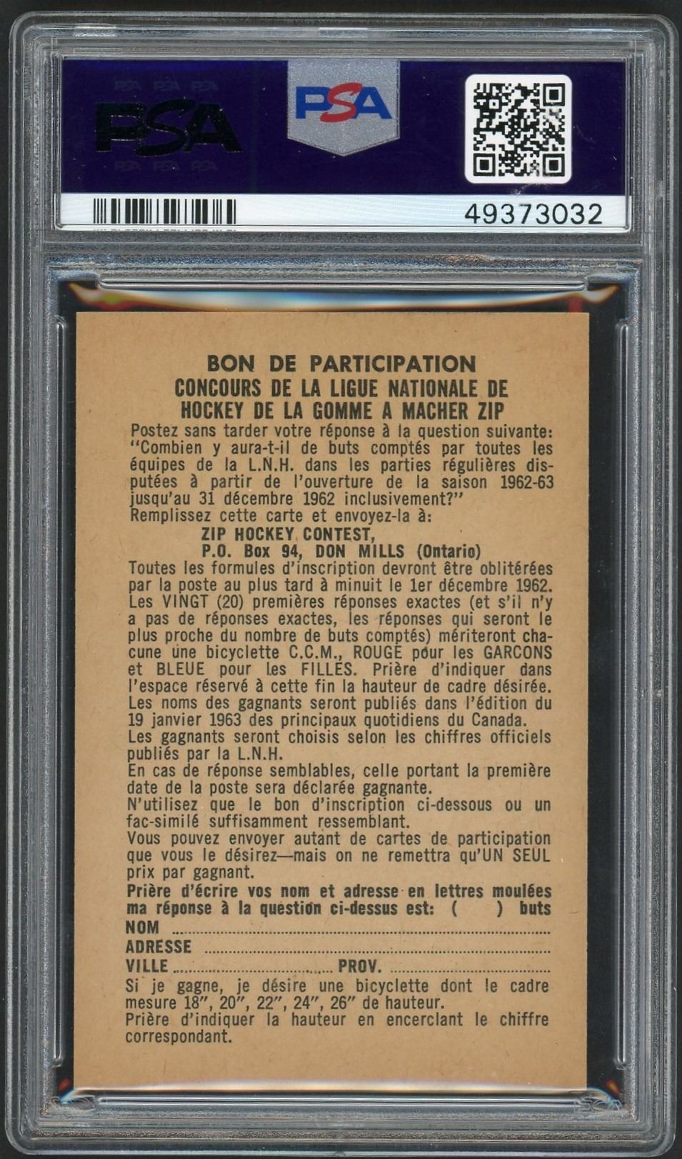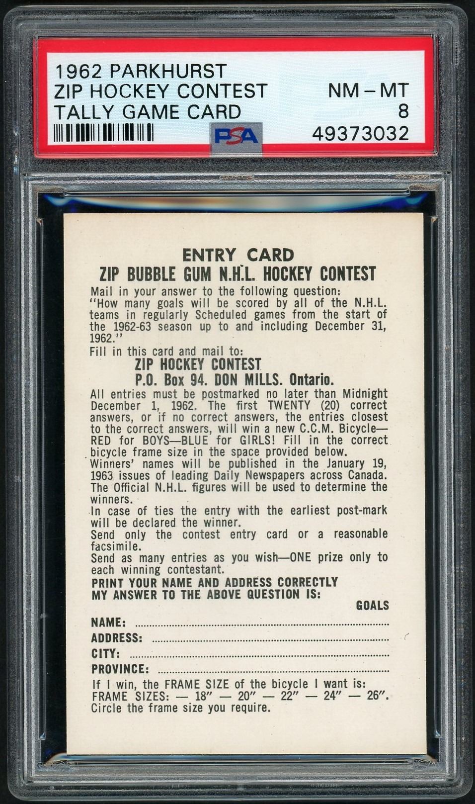 Ultra high grade contest card from the 1962-63 Parkhurst set. This, along with the "Tally" card, make this set truly complete. Graded 8 NM-MT by PSA!